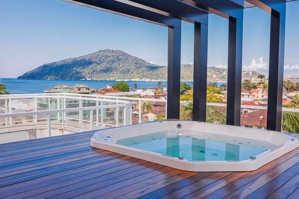 Em uma estrutura de concreto armado, o projeto, com vista integral para o mar e para as montanhas, privilegia acabamentos de alto padrão, como torneiras italianas, vasos Roca e cubas Sabbia, além de contar com pé-direito de 3 metros, venezianas elétricas, ar-condicionado em todos os cômodos e água quente em banheiros e cozinha. Com três vagas de garagem e hobby box, é um imóvel exclusivo para quem busca viver ou veranear com conforto e elegância.